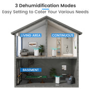 Powerful Home Dehumidifier: Removes up to 150 pints of moisture daily (95℉, 90% RH) and covers areas up to 7,000 sq. ft. Adjustable humidity range from 30% to 80%, with 4 modes: Living (50% RH), Basement (45% RH), and Continuous (30% RH).