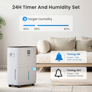 High-Capacity Home Dehumidifier: Removes up to 120 pints of moisture daily (95℉, 90% RH), covering areas up to 6,000 sq. ft. Adjustable humidity range from 30% to 80%, with 4 customizable modes: Sleeping (55% RH), Living (50% RH), Basement (45% RH), and Continuous.