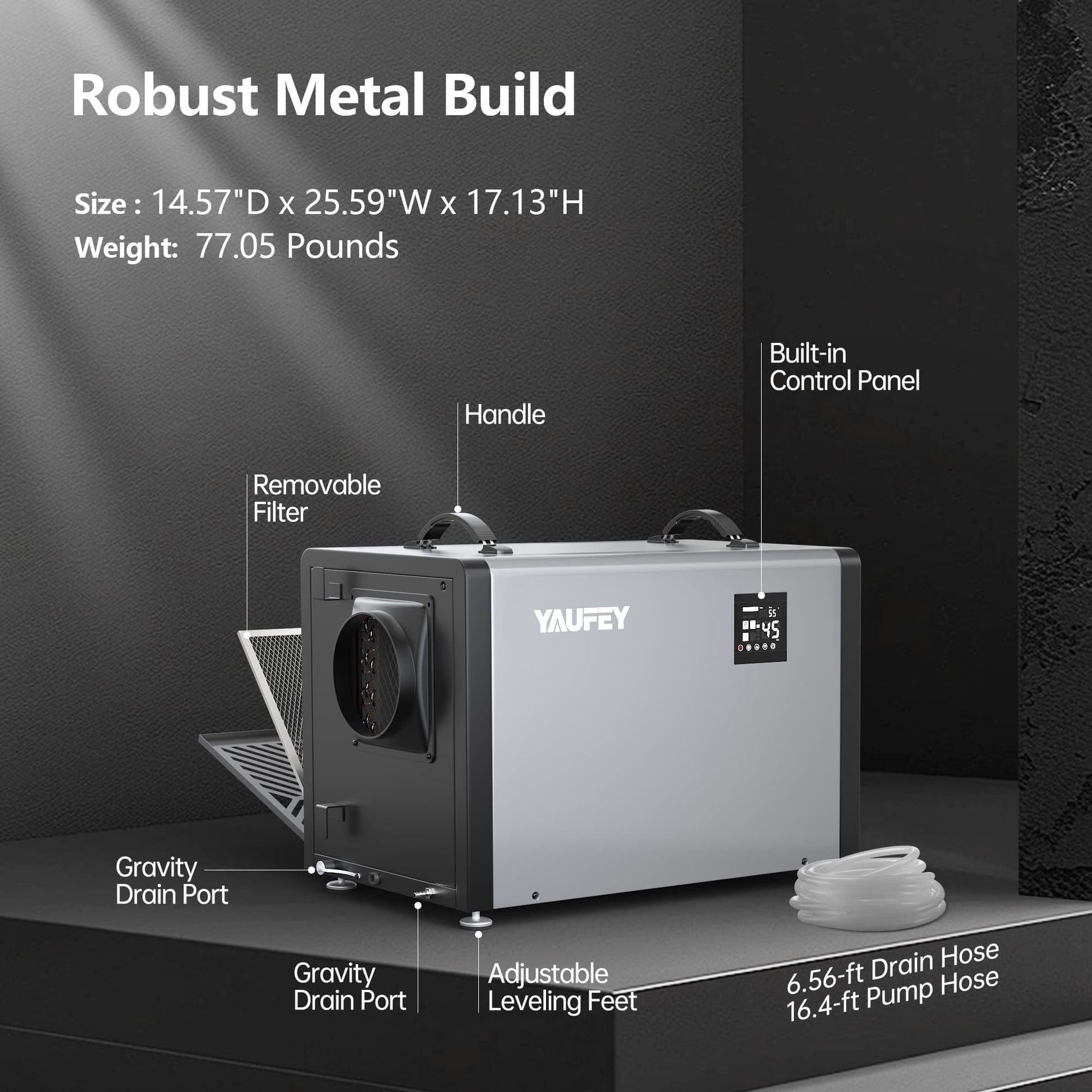 - Flexible Drainage Options – Choose between gravity drain or use the built-in condensate pump with a 16.4 ft. vertical lift, allowing continuous drainage to a sink or out-of-area drain.
